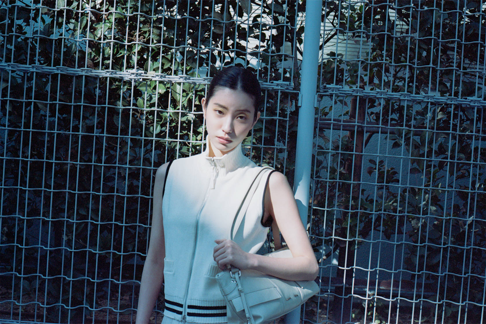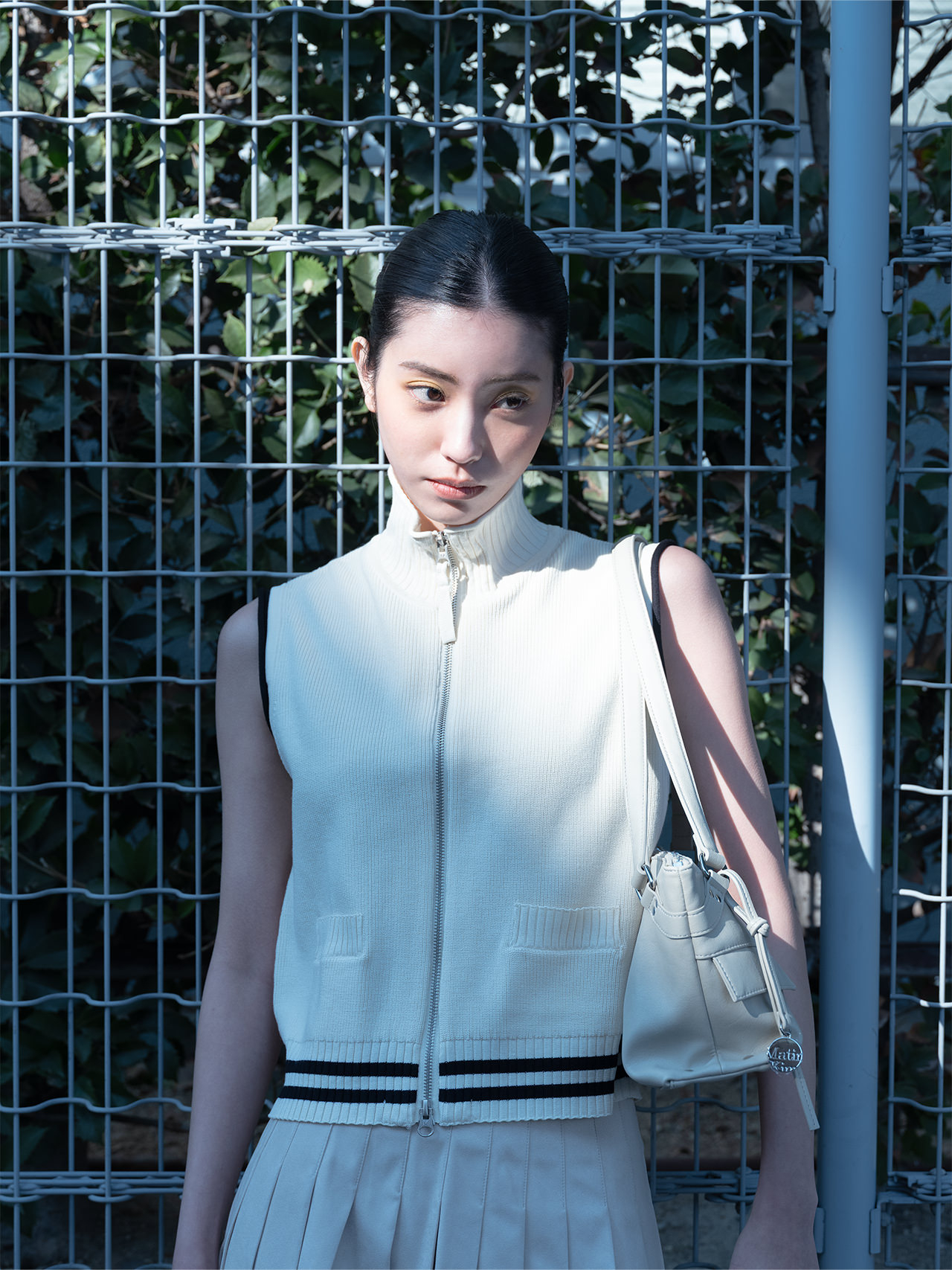 北澤舞悠さんとJEYさんが纏うのは、Matin Kimの“白”をリンクさせたスタイル。北澤さんは、ライン配色がアクセントになったアイボリーのニットベストにライトベージュのプリーツミディスカートを合わせた柔らかなコーディネート。横長シルエットのショルダーバッグとロングブーツがほどよい重さを添え、春の光に映える軽やかさと芯のあるムードを両立する。