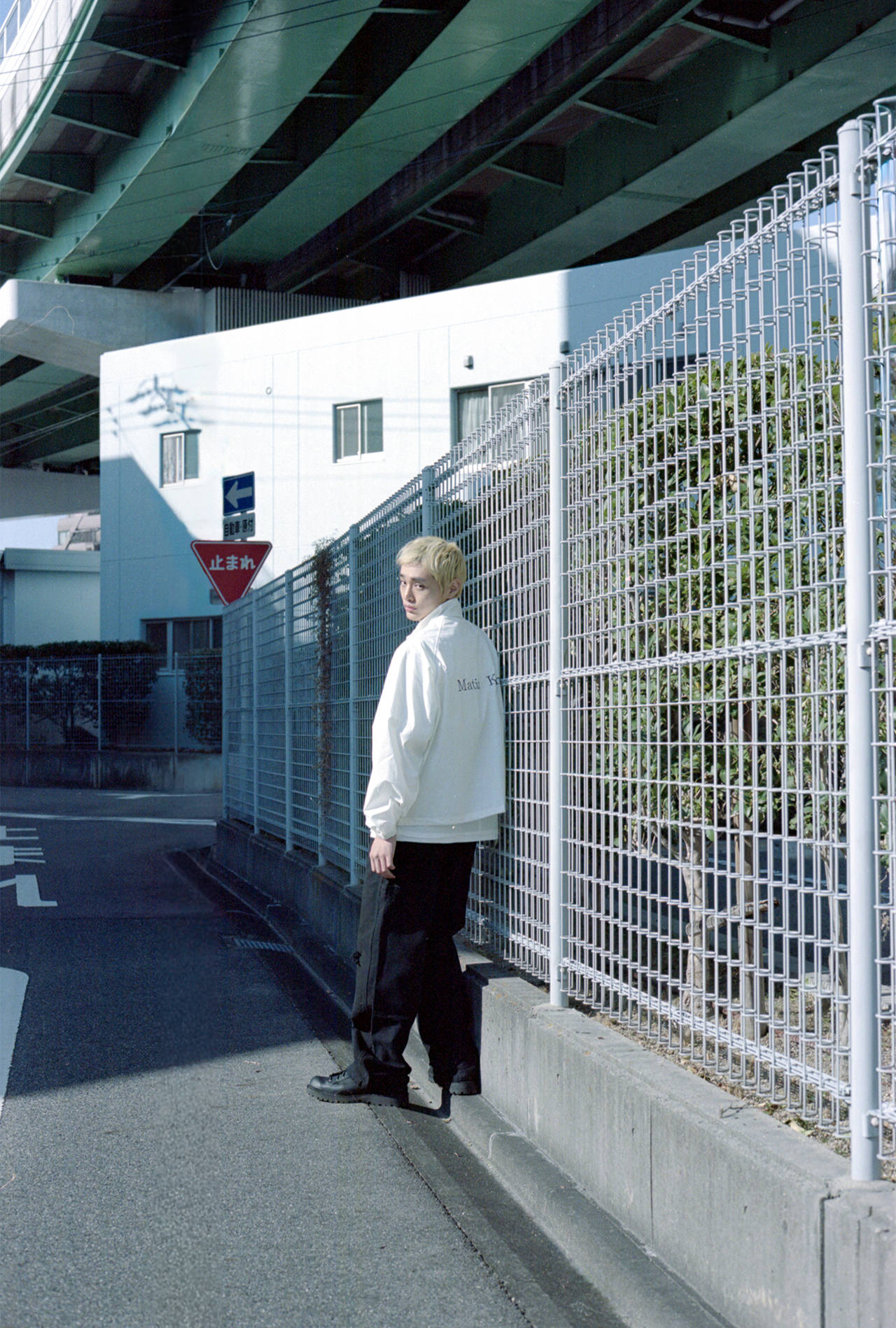 一方、JEYさんはロゴプリントと配色ステッチが効いたホワイトのコーティングジャンパーに、白のロゴトップスを重ね、ブラックのワークパンツで引き締める。軽やかなホワイトと無骨なボトムのコントラストが、ストリートらしいバランスを生み出している。