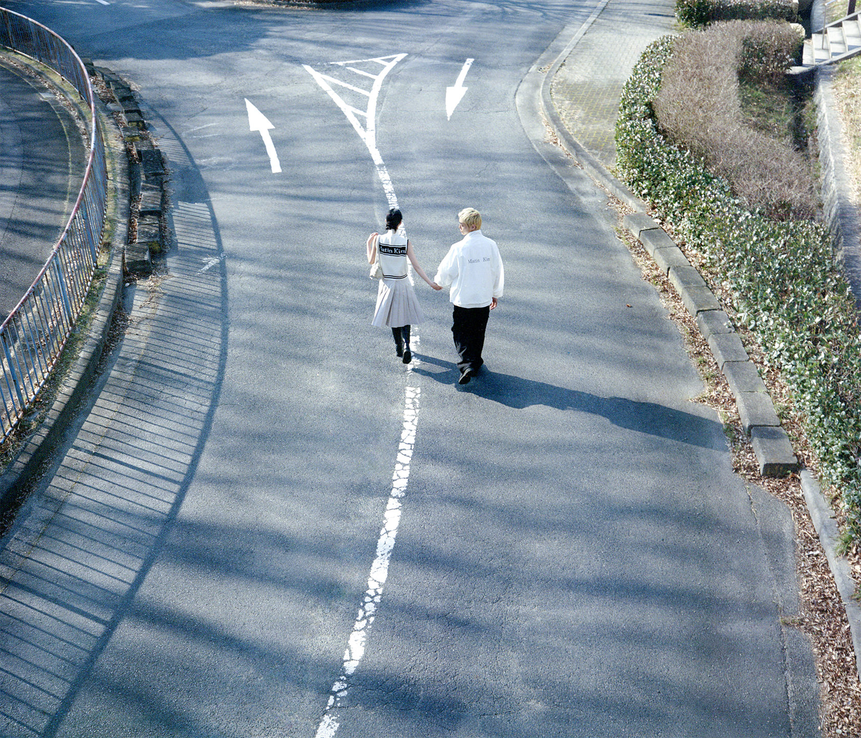 撮影中、いつも自然に寄り添い合うふたり。カメラが止まった瞬間も、その距離は変わらない。視線が合えば自然と笑い合い、移動するときは当たり前のように手をつないで歩き出す。その姿は演出ではなく、ただそこにある日常の延長のようだった。