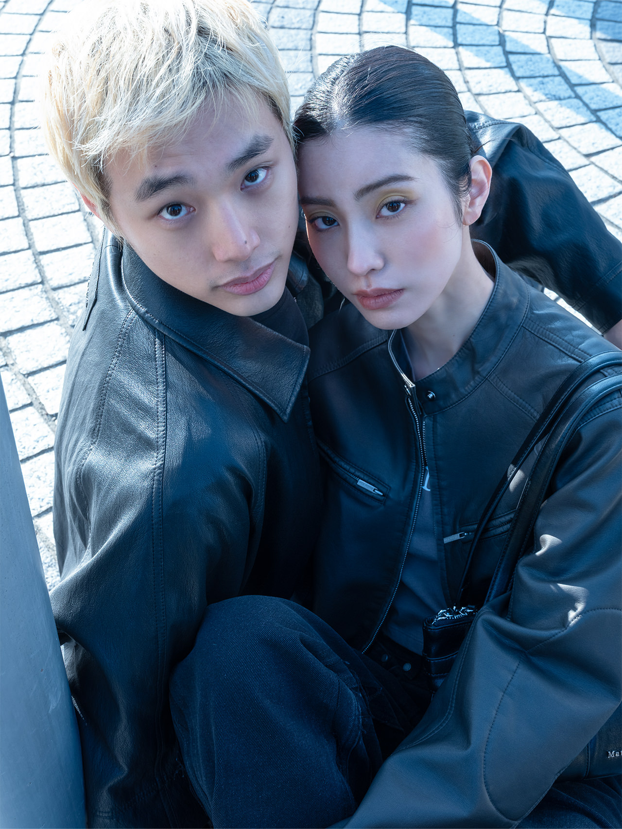 北澤舞悠さんはウォッシュ加工のフェイクレザージャケットに、ワイドデニムを合わせたスタイル。スタッズベルトと横長バッグがストリート感をプラスする。JEYさんは、フェイクレザージャケットにキャンパス素材のルーズフィットなワークパンツをコーディネート。無骨さと抜け感が共存する、モードなストリートスタイルに。