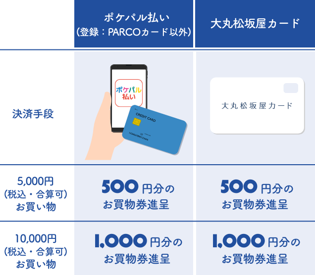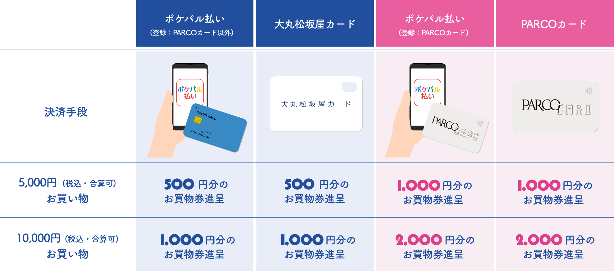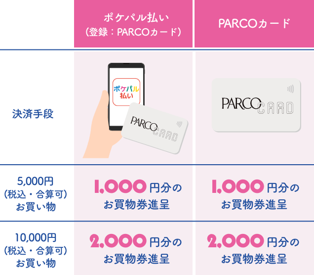 ※当日のお買い物はポケパル払い(登録カード:PARCOカード以外)・大丸松坂屋カード支払いであっても、引換の際にPARCOカードにご入会いただいたお客様はポケパル払い(登録カード:PARCOカード)・PARCOカード支払いと同様のお買物券進呈。