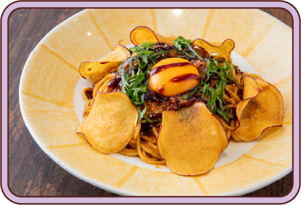 1,529円ソースに「つけてみそかけてみそ」を使い、ひと味違うボロネーゼに。大葉・卵黄・さつまいもチップスを合わせた、個性あふれる一品です。