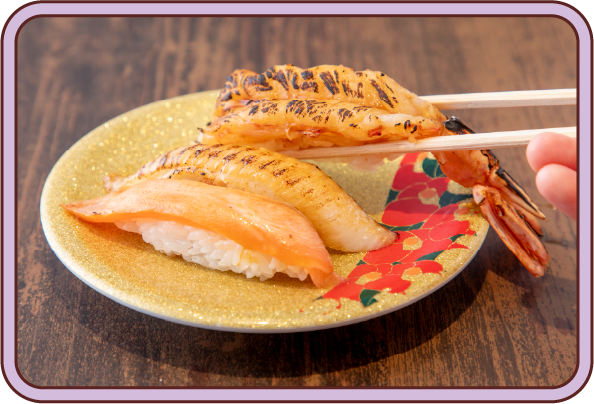 638円炙ったサーモン・えんがわ・赤海老を、「つけてみそかけてみそ」と金沢の醤油「直源醬油」を組み合わせた味噌ダレで仕上げました。