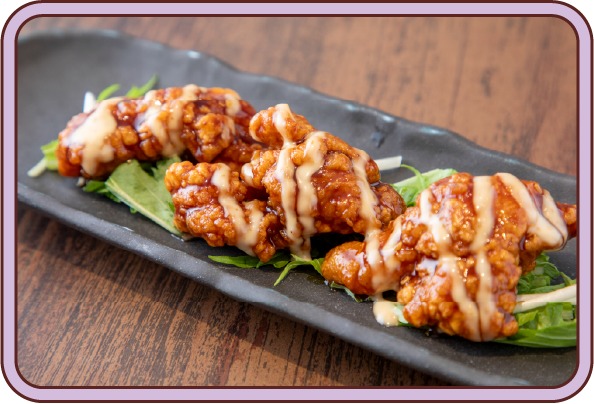 3個528円・5個858円自慢の唐揚げに、味噌やマヨネーズを使った油淋鶏ソースをトッピング。濃厚かつさっぱりした味わいは、一度食べればやみつきに!