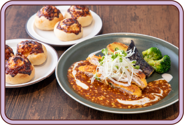 1,859円大葉とチーズのミルフィーユカツレツを、味噌・バター・ねぎを効かせたソースでどうぞ。パン食べ放題には「みそマヨチーズチャバタ」も登場!