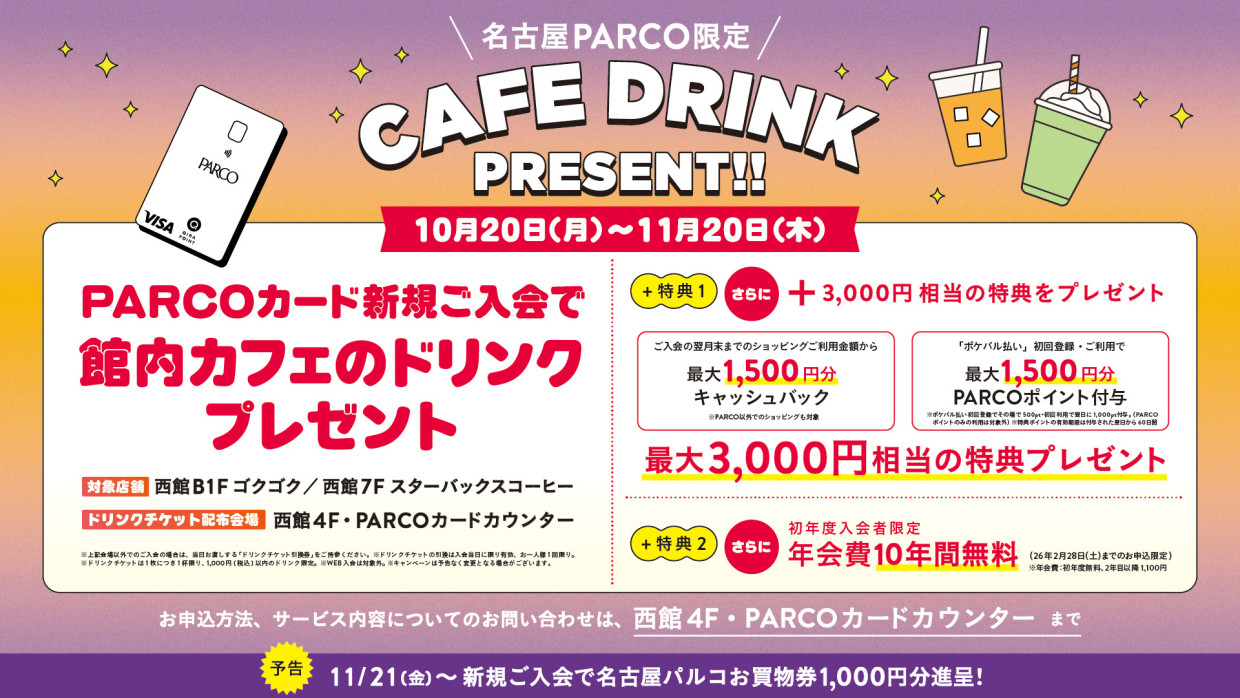 【PARCOカード】新規ご入会で館内カフェのドリンクプレゼント