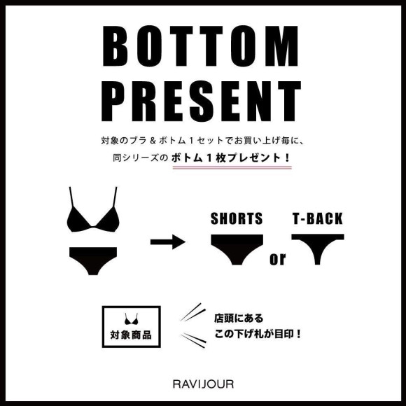 ☆対象のブラ、ボトムをセットでお買い上げ毎に同シリーズのボトムを1枚プレゼントいたします☆