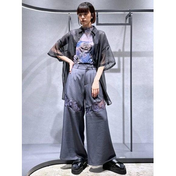 ワイドパンツシルエットで膝上〜太ももあたりにシアー刺繍がきます!