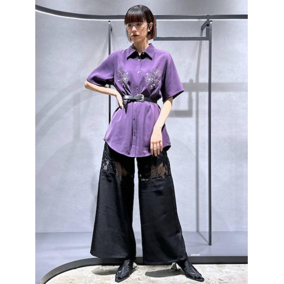 ワイドパンツシルエットで膝上〜太ももあたりにシアー刺繍がきます!