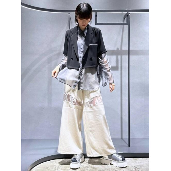 ワイドパンツシルエットで膝上〜太ももあたりにシアー刺繍がきます!