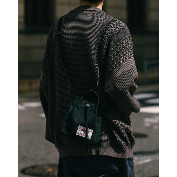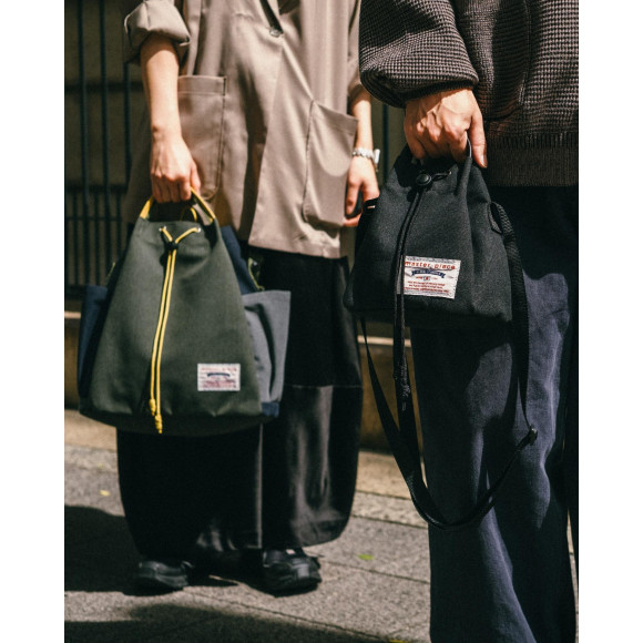 口元にはDカン付きのホックがあるのでカギなどをぶら下げて内装のポケットに入れていただけます。コードを絞って巾着としも、緩めてトートバッグとしてもお使いいいただけるので、巾着は可愛すぎるという方は口元を緩めて斜め掛けでラフに使えるカジュアルシリーズです。