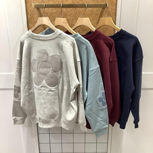 フラワーモチーフのワッペンがインパクトのあるクルーネックスウェットが入荷しました♪
