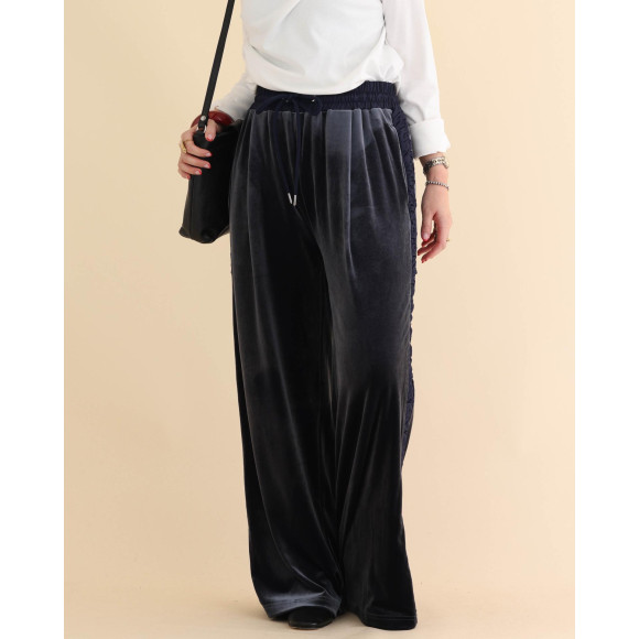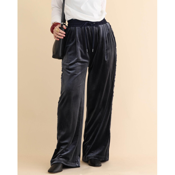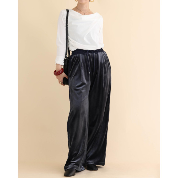 うっとりするようになめらかな肌触りのベロア生地に、濃紺のカラーリング。優しく品のある光沢は、まるで星空の航海のよう。物語を紡ぐようにオーラのあるアイテムでありながら、サイドに別布でラインを入れることで、カジュアルな要素をプラス。街で気軽に着られるラクな着心地と、程よいオシャレ感を両立したパンツに仕上げました。