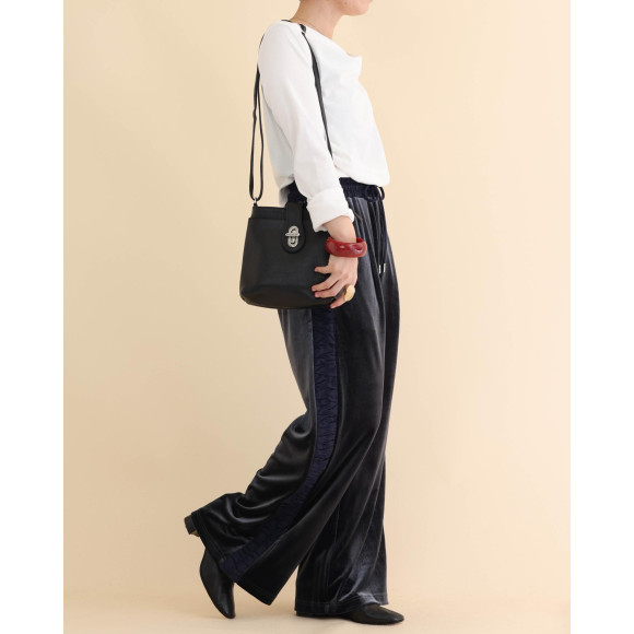 サイドのラインはベロアの生地感に負けないように太めのデザインに。ギャザーを寄せることで立体感を出しました。いつものカットソーやニット、シャツに合わせて日常に。ブラックのトップスやワンピースに合わせて、特別な日のお供にも。
