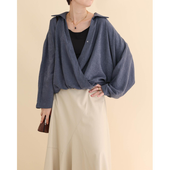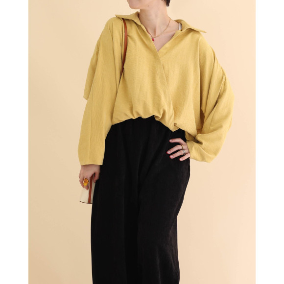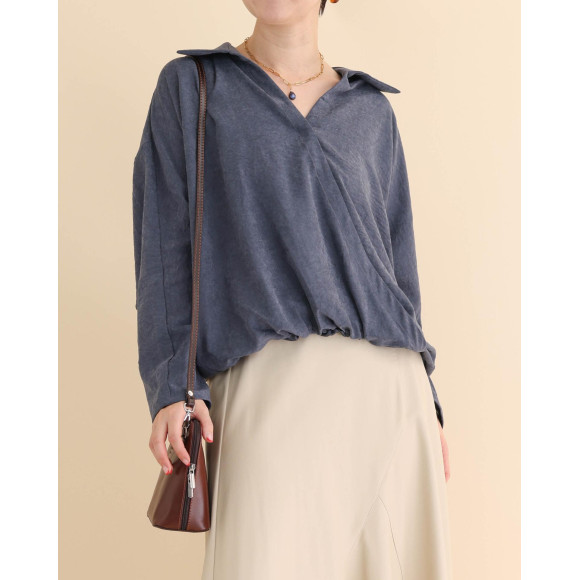 女性らしい柔らかさと程よい抜け感を生む、カシュクールデザイン。胸元に1つスナップボタンをあしらい、2種類のデザインでご着用いただけるように作成しました。フロントの裾にはゴムを入れて、ボトムにインしなくてもスッキリと着こなせるディテールにもこだわっています。