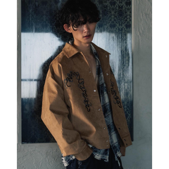 胸元にはウエスタン特有の刺繍ラインを、蛇と鎖が絡み合うグラフィックで表現し、象徴的なモチーフへと昇華。