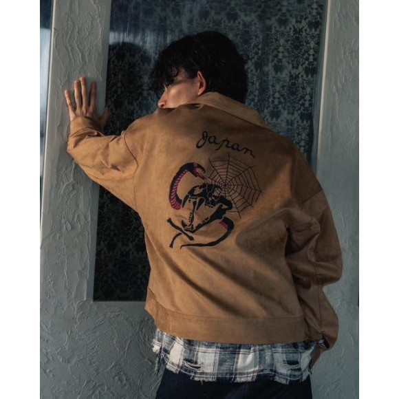 背面にはスーベニアジャケットを想起させる大胆な刺繍を施し、髑髏のモチーフを虎の頭蓋骨にアレンジ。