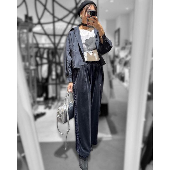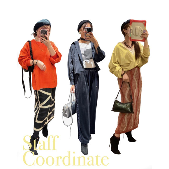 ファッション好きのお客様にオススメのベロアパンツを使った中央のスタイリングは、ワントーンでまとめてセットアップ風に。トレンド感がありながらも、綺麗な印象でご着用いただけるので、幅広い年代の方にオススメです⭐︎