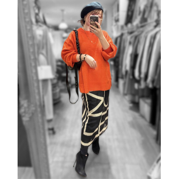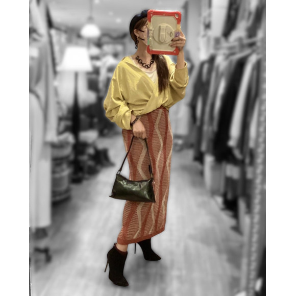 お問い合わせの多いカシュクールシャツに、存在感のあるモールヤーンニットをミックスした右のスタイリング。上級な印象を作るカラーブロックですが、小物を黒で統一することでまとまりのある仕上がりに。