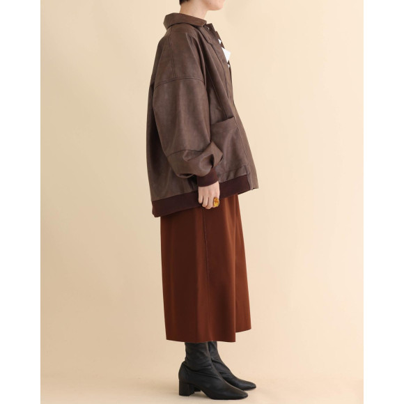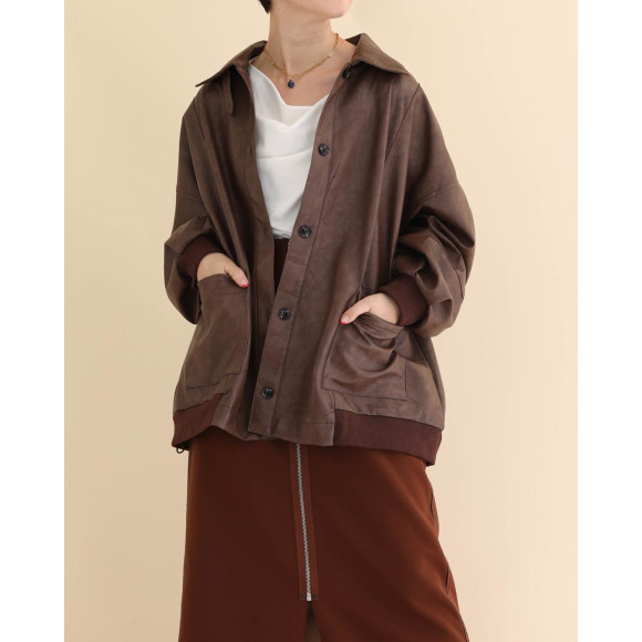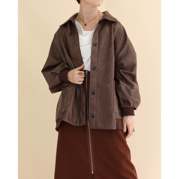 ヴィンテージテイストの、程よいツヤのあるエコレザーを厳選したジャケット。フライトジャケットのディテールに、リラクシングなフォルムや、ボリュームを持たせた袖など、女性らしい柔らかなエッセンスを加えました。