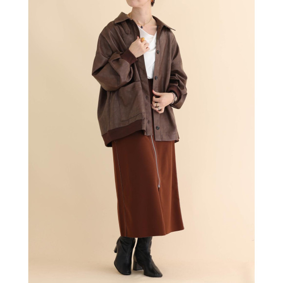 中にどんなアイテムを着ても、コーデがしやすいストレートなシルエットですが、フロントに切替を入れることで、立体感が生まれるデザインで作成。裾と袖元にリブを利用し、メリハリをつけました。襟元にもボタンをあしらっているので、襟を立ててご着用いただくことも可能です。