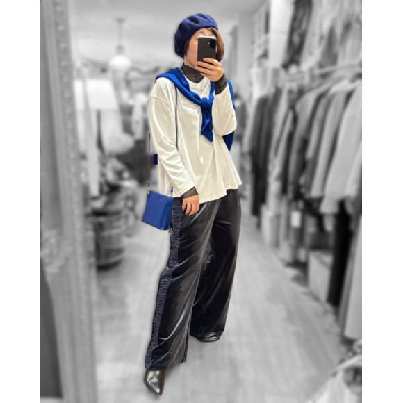 中央のスタイリングは、青を差し色で使いながらも、ポイントを複数作ることで統一感がありつつ、遊びの効いた印象に。お選びいただいたバッグを使って、スタイリングのご相談も承っていますので、ぜひお気軽にご相談くださいませ。