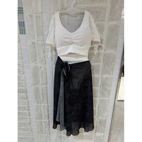 アウターライクな表面変化の生地を使用。透け感のあるシフォンのパフスリーブは丸みのあるボリューム感がポイント。
