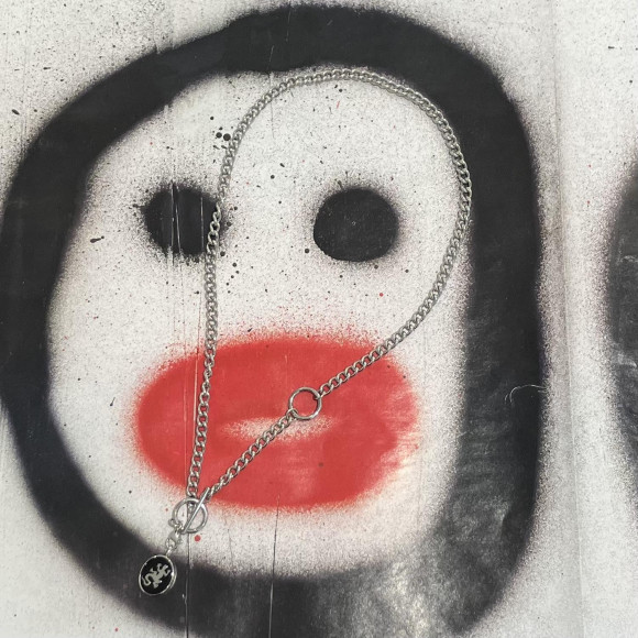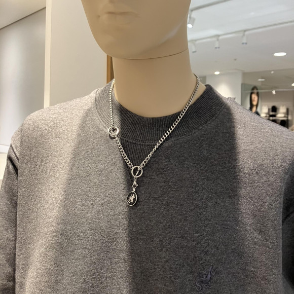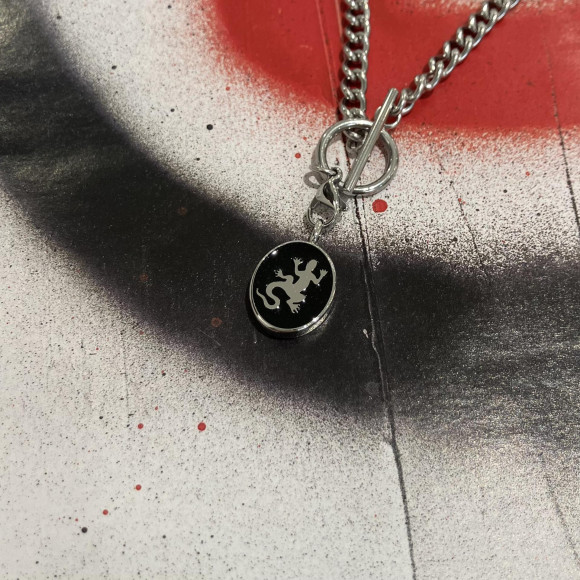 チェーンネックレスのトップに付いたレザールがシンプルながらもとってもオシャレ。