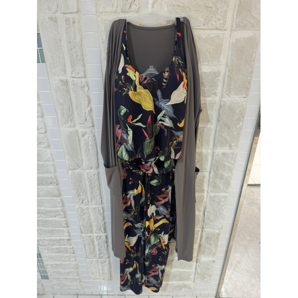 ビーチに映える大胆なボタニカル柄のタンキニとロングパンツのセットアップ。