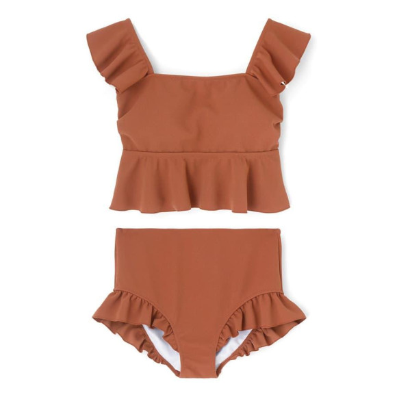 表面変化の生地を使用した、レトロな印象のフレアトップスとボックスデザインショーツのビキニ。