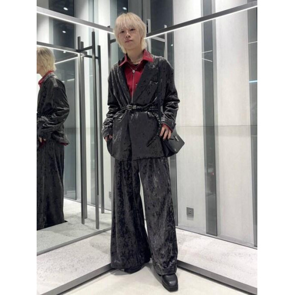 ベロアのセットアップを使ったスタイル! ブラウンが混ざった温かみのある色味で珍しく被りにくい合わせ方です! アクセントに赤の刺繍シャツを合わせることでカッコよくオシャレに着たい日に向けたスタイリングです! 色物とも合うセットアップなので案外使い回しができます!