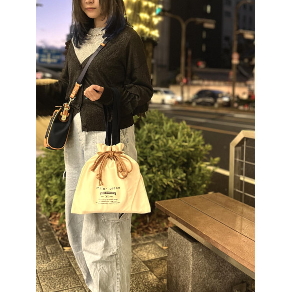 この冬から新たに登場したオフホワイトカラーの布製の生地を使用したラップバッグ(Sサイズ:¥880- Mサイズ:1,100- どちらも税込価格)。