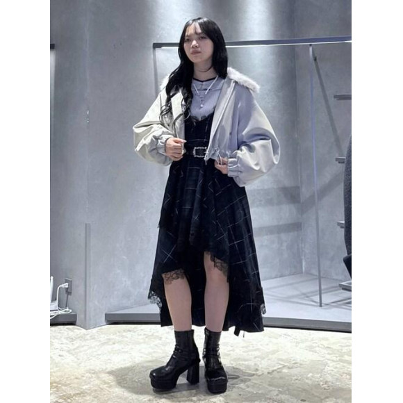 □レースとチェック生地の異素材で組み合わせる事でエッジの効いたモードな雰囲気に
