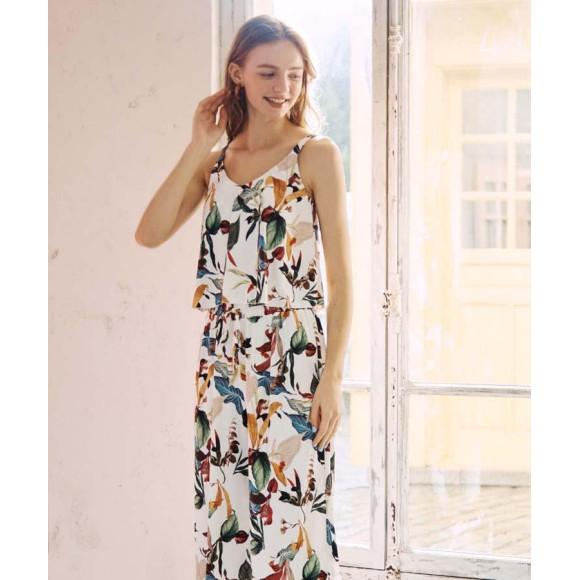 ビーチに映える大胆なボタニカル柄のタンキニとロングパンツのセットアップ。
