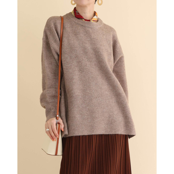 1枚ではもちろん、中にタートルネックやシャツを重ねやすい、クルーネックのデザイン。身頃の裾は太めのリブで切り替えることで、上半身をコンパクトに、脚を長く見せる視覚効果を。ヒップが隠れる長めの丈ですが、スタイルがよく見えるように設計しました。