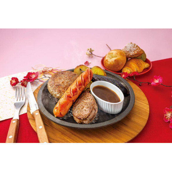 黒毛和牛ハンバーグ、デンマークソーセージ、ハンギングテンダーステーキを贅沢に盛り合わせ、香り豊かなトリュフソースで仕上げたプレミアム鉄板グリル。