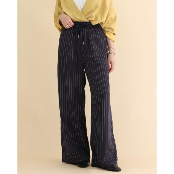 形が綺麗なワイドパンツに、白のストライプを入れてさらに美脚効果をアップさせた1枚。ストライプは細くすることで、柄アイテムの旨みがありながら、さりげなさを感じるアイテムに仕上げています。
