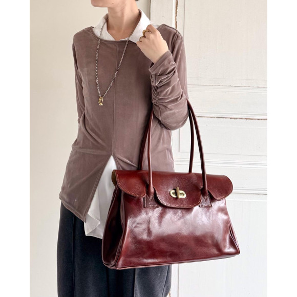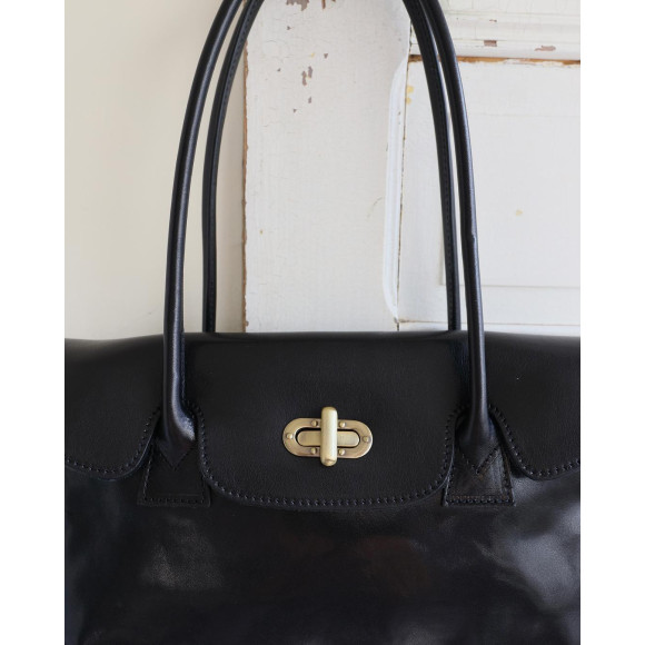 デイリーにもお仕事にも使いやすい、やわらかな質感のカーフレザーに台形のフォルム。シンプルな二重構造に、かぶせと金具のディテールをプラスすることで、使いやすさとアイコニックなデザインを両立したバッグに仕上げました。金具はなじみの良くなるよう、アンティークゴールドのものを選びました。