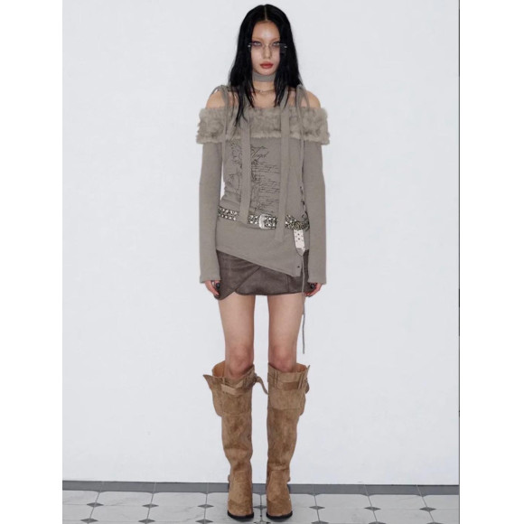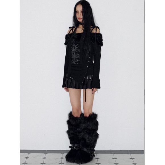 【NOT KNOWING】Fur Off Shoulder Lace Up Top