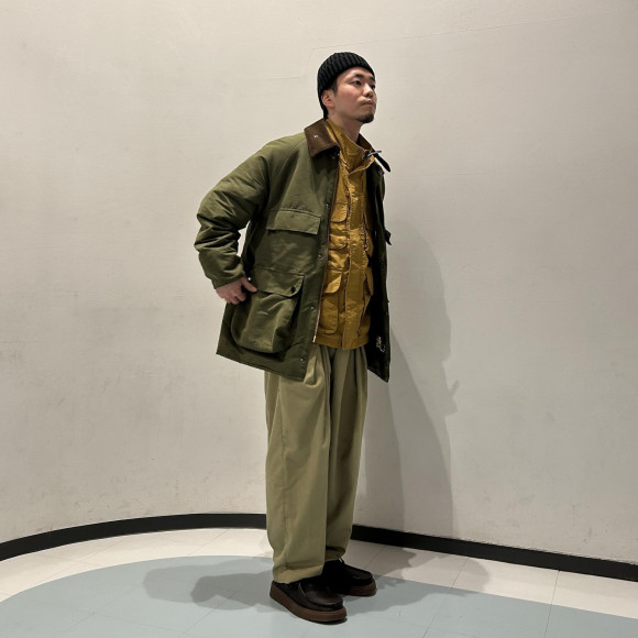 遊びが欲しいので、ジャケットのインナーには立体感のある多ポケットのアウトドアベストを合わせてアクティブな雰囲気に。