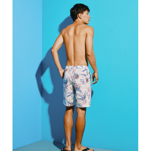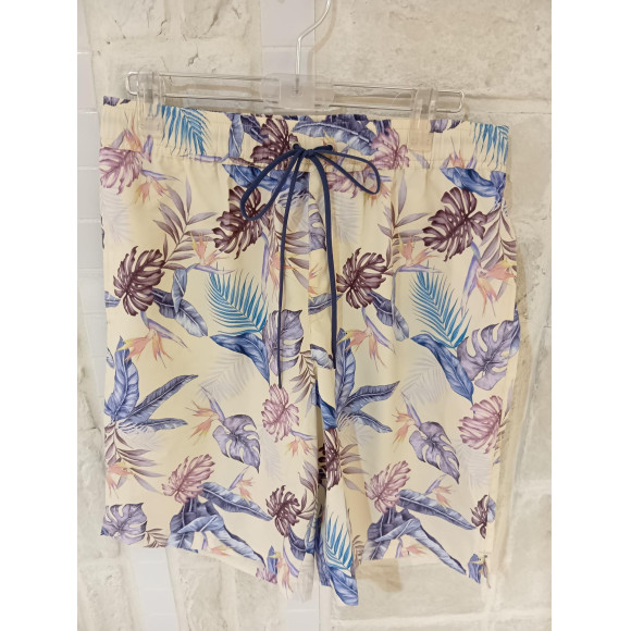 ヴィンテージ調のリーフプリントがリゾートに映えるメンズ水着でウエスト1周ゴムで着心地にこだわった設計です。