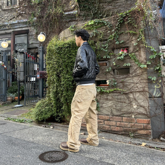 今回はレザージャケットにペインターパンツ、足元はミュールで抜け感を出したスタイルで。