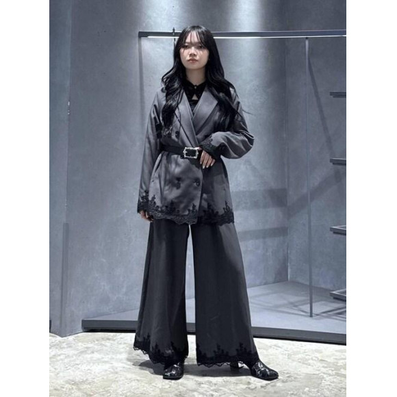 ジャケットとジャンプスーツの裾がレースになっているのがポイント!