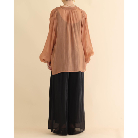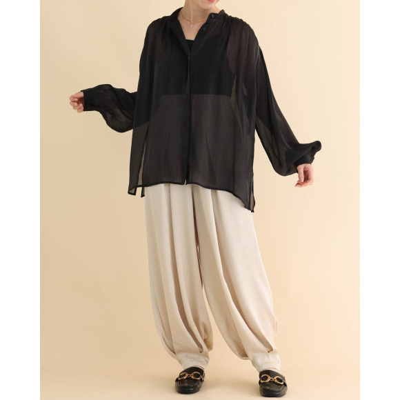 日常に着やすいように、お洗濯後ノーアイロンでご着用いただけるポリエステル生地を厳選。とろんととろける質感を生かし、肩にたくさんのギャザーを入れてドレープが出るようにデザインしています。前立ては比翼にしてスッキリと。絶妙なバランスで仕上げた1枚となっております。