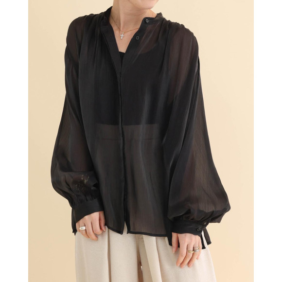 青空ににじむ、春のルミエール。やさしい夢を見させてくれそうな、柔らかな光沢の楊柳生地を使用したシャツです。ふんわり袖とシアー素材がそよ風のような軽やかさを、スタンドカラーが清潔感と親近感を生む、新しい出会いや機会が増える春コーデにぴったりのアイテムです。