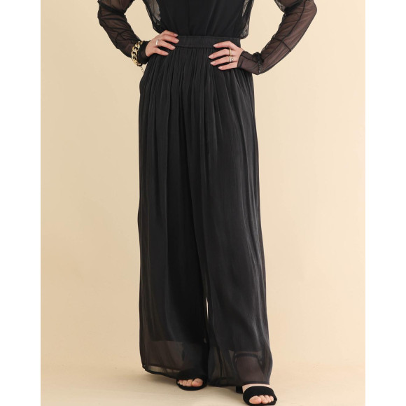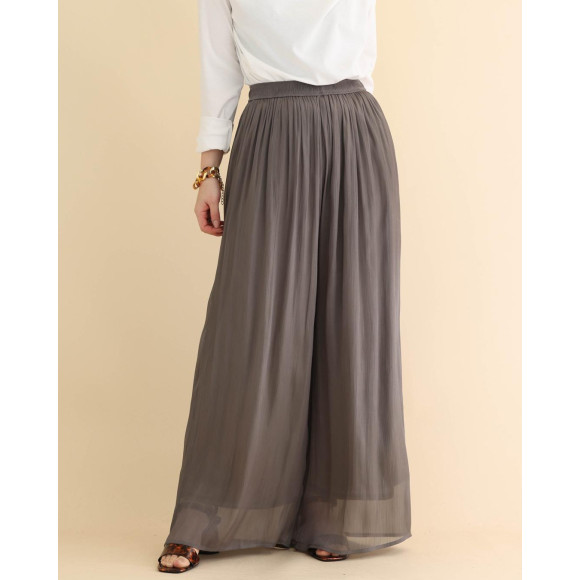 ストレッチ性の高い裏地をつけることで、着やすさも重視。表地と裏地の丈に差をつけることで、裾の透け感が生きるように計算しました。ウエストは総ゴムにして、リラクシングな着心地に。デイリーから、セレモニーなどのイベントまで、幅広く活躍するパンツです。