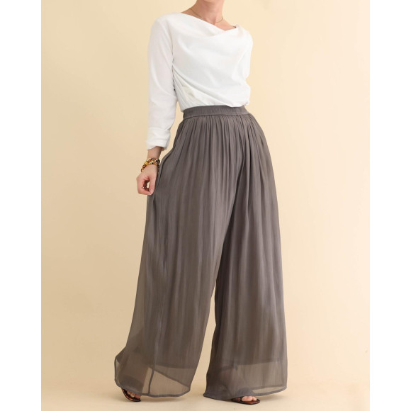 羽衣のような儚さをたたえた、シアーな楊柳素材を使用したパンツ。キラキラと輝く柔らかな光沢は、まるでパリの朝焼けのよう。とろけるように滑らかな生地から生まれるドレープがフェミニンな芳香を漂わせます。時を封じ込めたように、普遍的な美を象徴するような1枚に仕上げました。