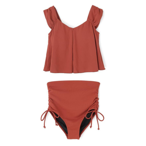 ハイウエストのショーツはギャザーのデザインで気になるお腹部分を、カバーしてくれます。