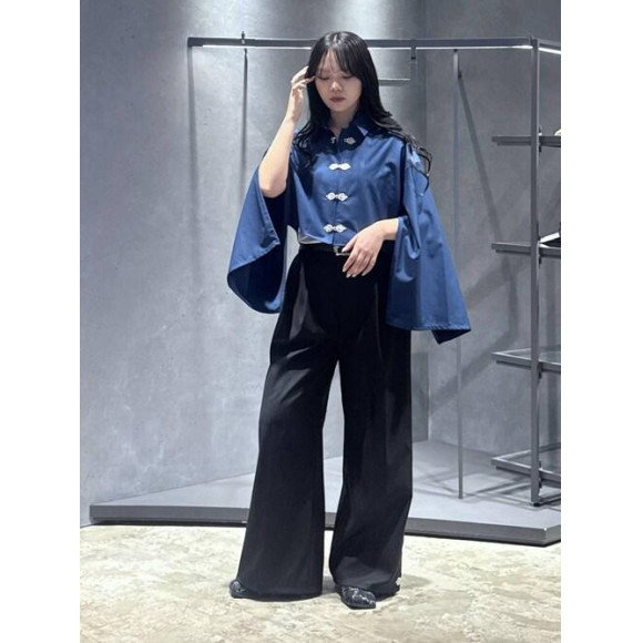 □裾のサイドにチャイナボタンをあしらったモードなワイドパンツ