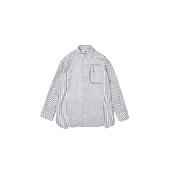 ”ATTACHED SHIRTS” 古着のリメイクのようなニコイチにしたデザイン。 綿100%に圧着というのは見慣れないと思うが、 実は綿素材と圧着に使用するバインダーは相性が良い素材。 100% Cotton (Premium striped broadcloth) A “2-in-1” style shirt with a vintage remake aesthetic. Bonded seams create a contrasting texture reminiscent of mixed materials.